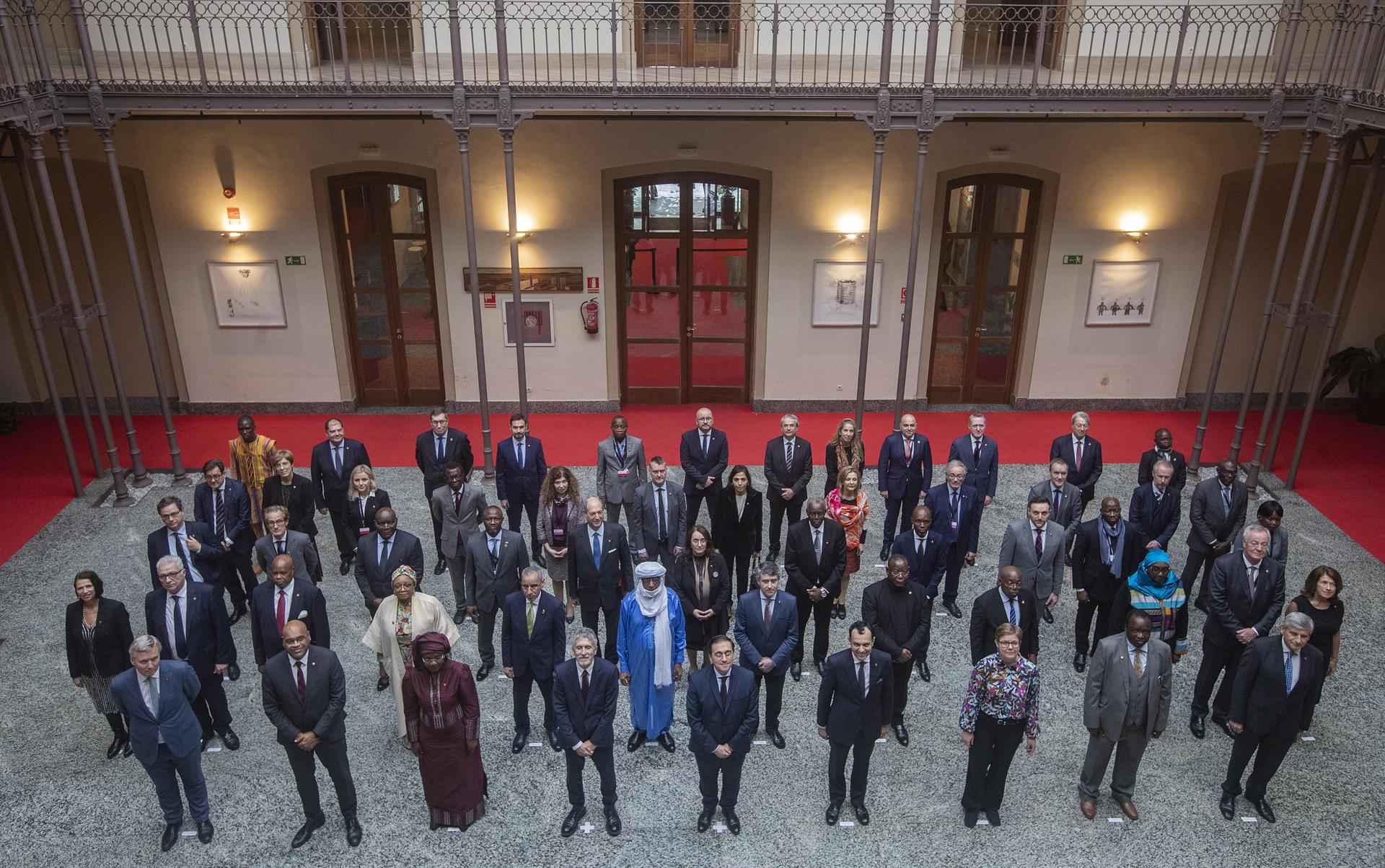 Le ministre Albares et le ministre de l'Intérieur, Fernando Grande-Marlaska, avec les participants au sixième dialogue euro-africain sur la migration et le développement, qui s'est tenu à Cadix. EFE